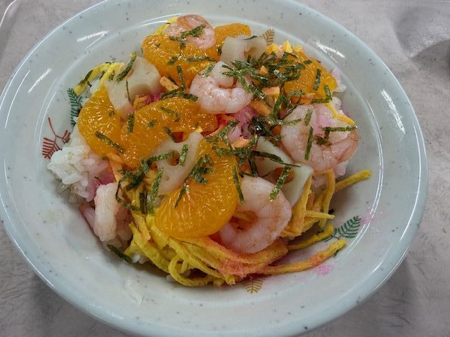 🍚12月15日の年忘れ会には「海鮮ちらし寿司、すまし汁、茶碗蒸し、オクラの和え物、みかん」をお出ししました。