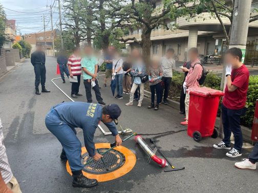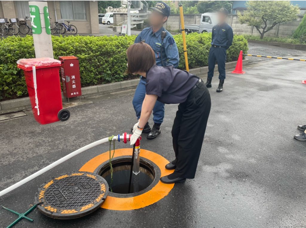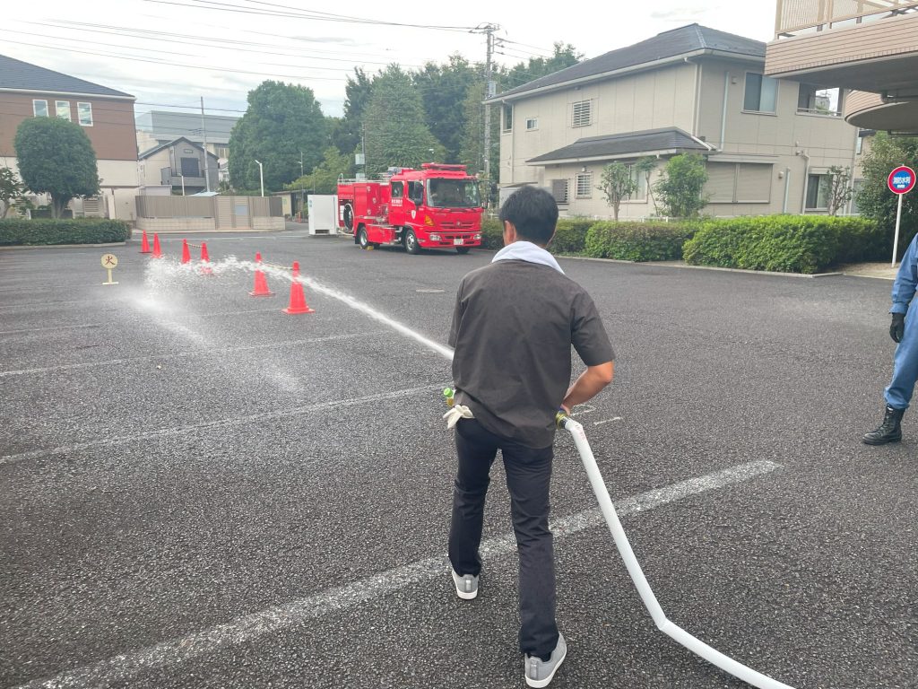 内容は「スタンドパイプを使用した放水訓練」です。消防署の方を招いて使用方法等をご指導いただきました。