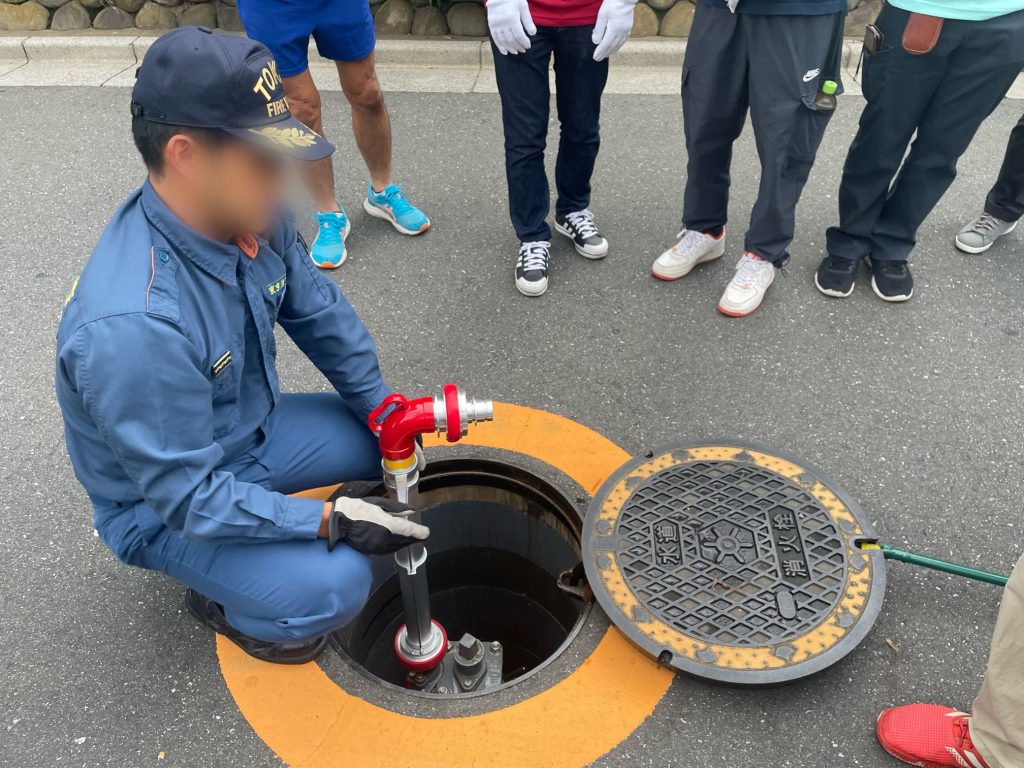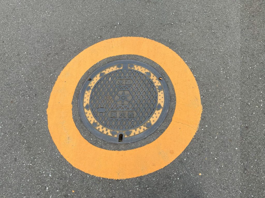 ↑写真のように、黄色い線で囲われたマンホールには、中に消火栓があります。