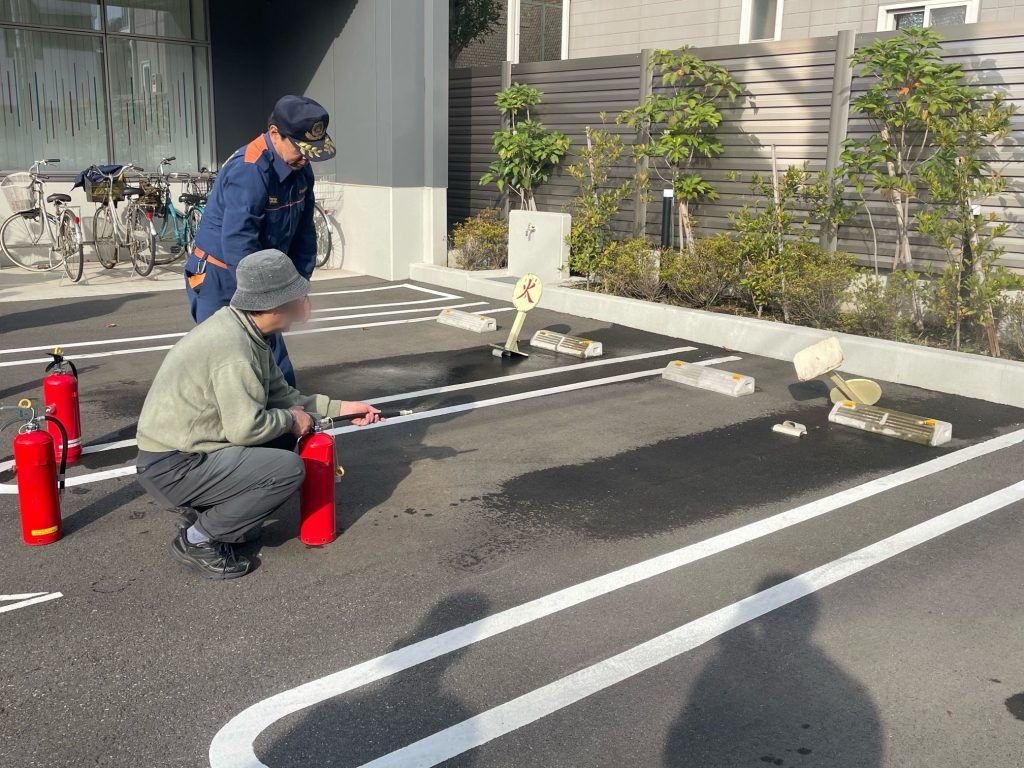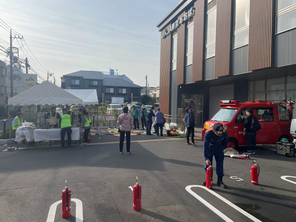 第二光陽苑は、JA東京あおば関町支店駐車場にて、初期消火訓練と応急救護訓練のブースを担当、来場した地域住民の訓練参加を運営委員や消防署員の方と共にお手伝いしました。