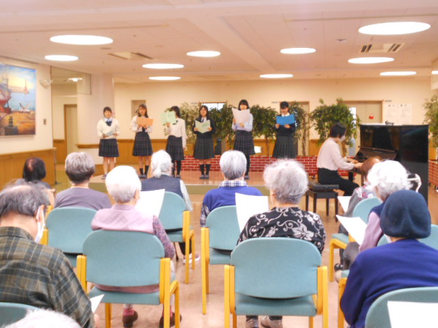 曲目は『川の流れのように』などの歌謡曲から、『もみじ』や『故郷』の童謡など、ご利用者の皆様に馴染みのある合唱曲を披露してくださいました。