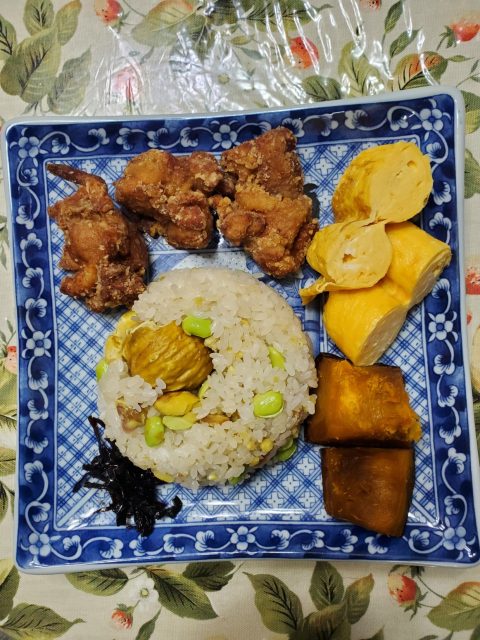 鳥の竜田揚げ、卵焼、かぼちゃの煮物、葉唐昆布ときのこの味噌汁を添えました。