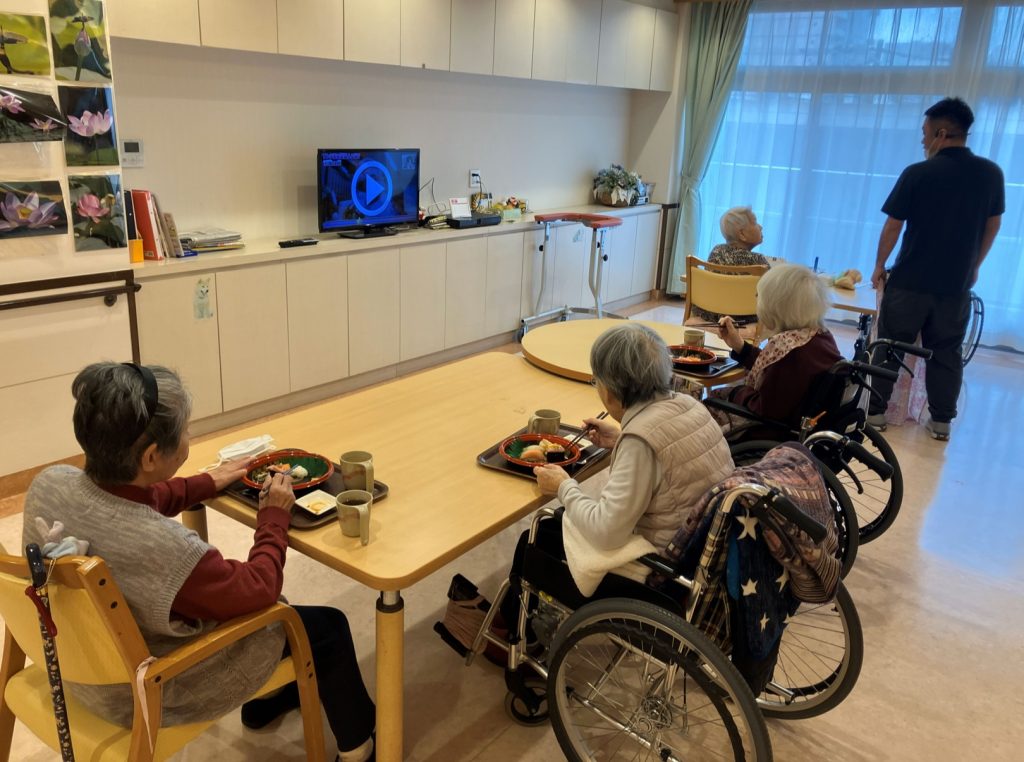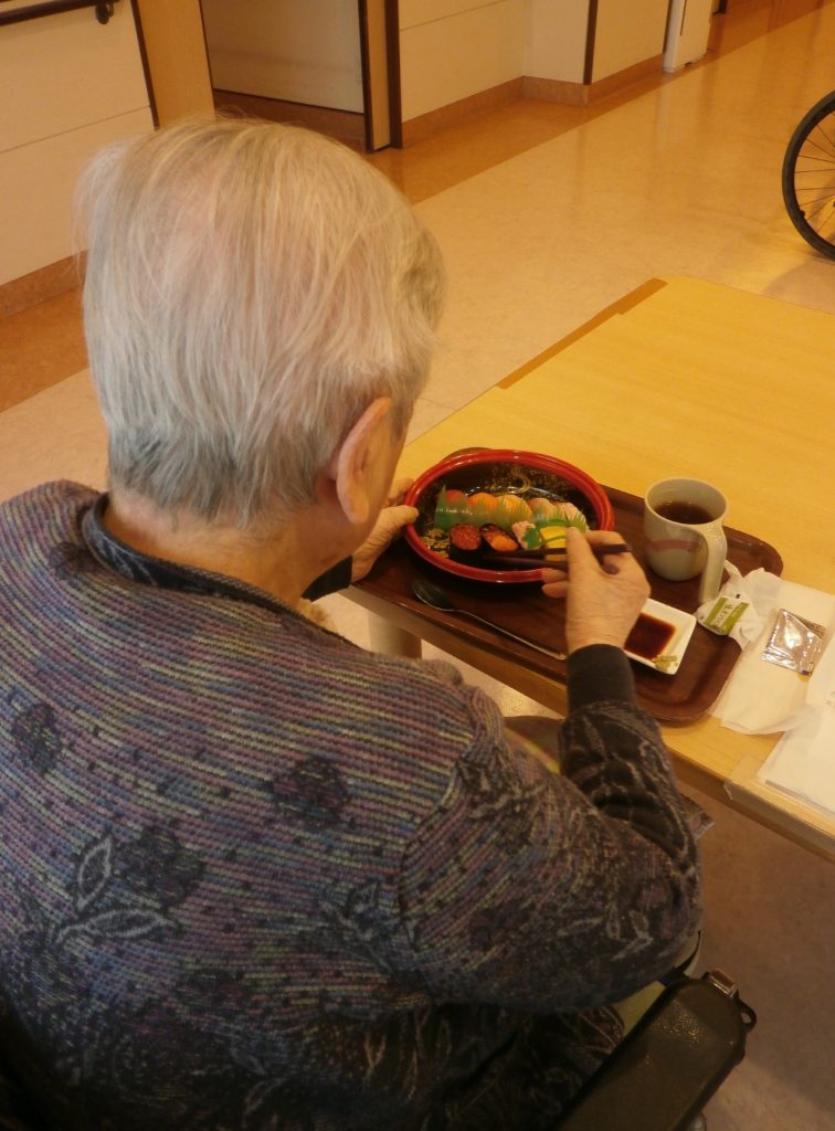 あるフロアでは昼食の部と午後の部の2部制で行いました。昼食の部は出前のお寿司を振る舞いました🍣😋皆様お寿司はお好きなようで、普段では見る事が出来ないような笑顔を見せていただきました😄